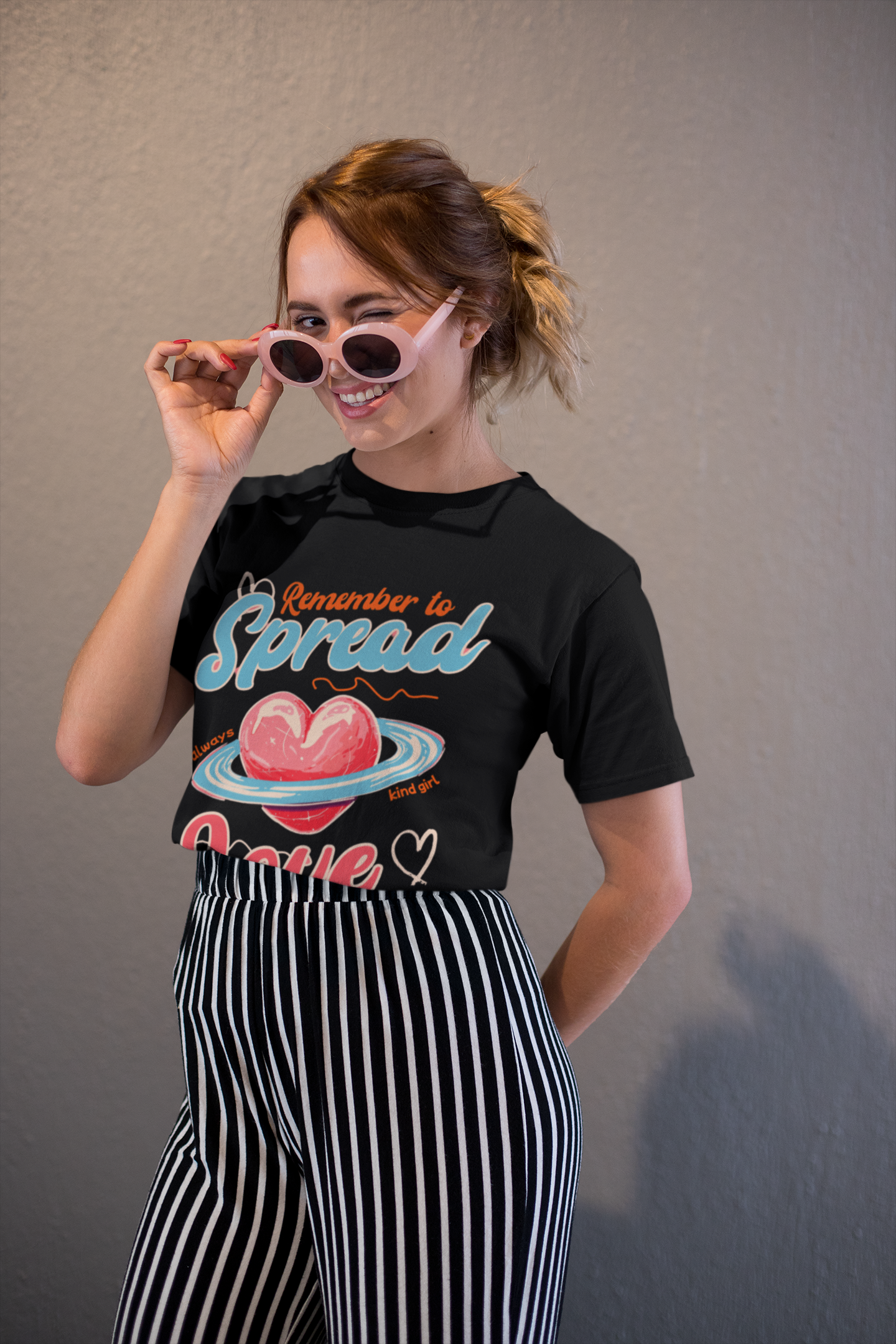 Featuring a beautiful heart-planet graphic with the words “Remember to Spread Love”, this Spread Love Womens TShirt perfectly blends comfort and creativity. The soft pastel tones against a solid black base make it eye-catching yet elegant—ideal for women who want to make a fashion statement while sending a positive message.