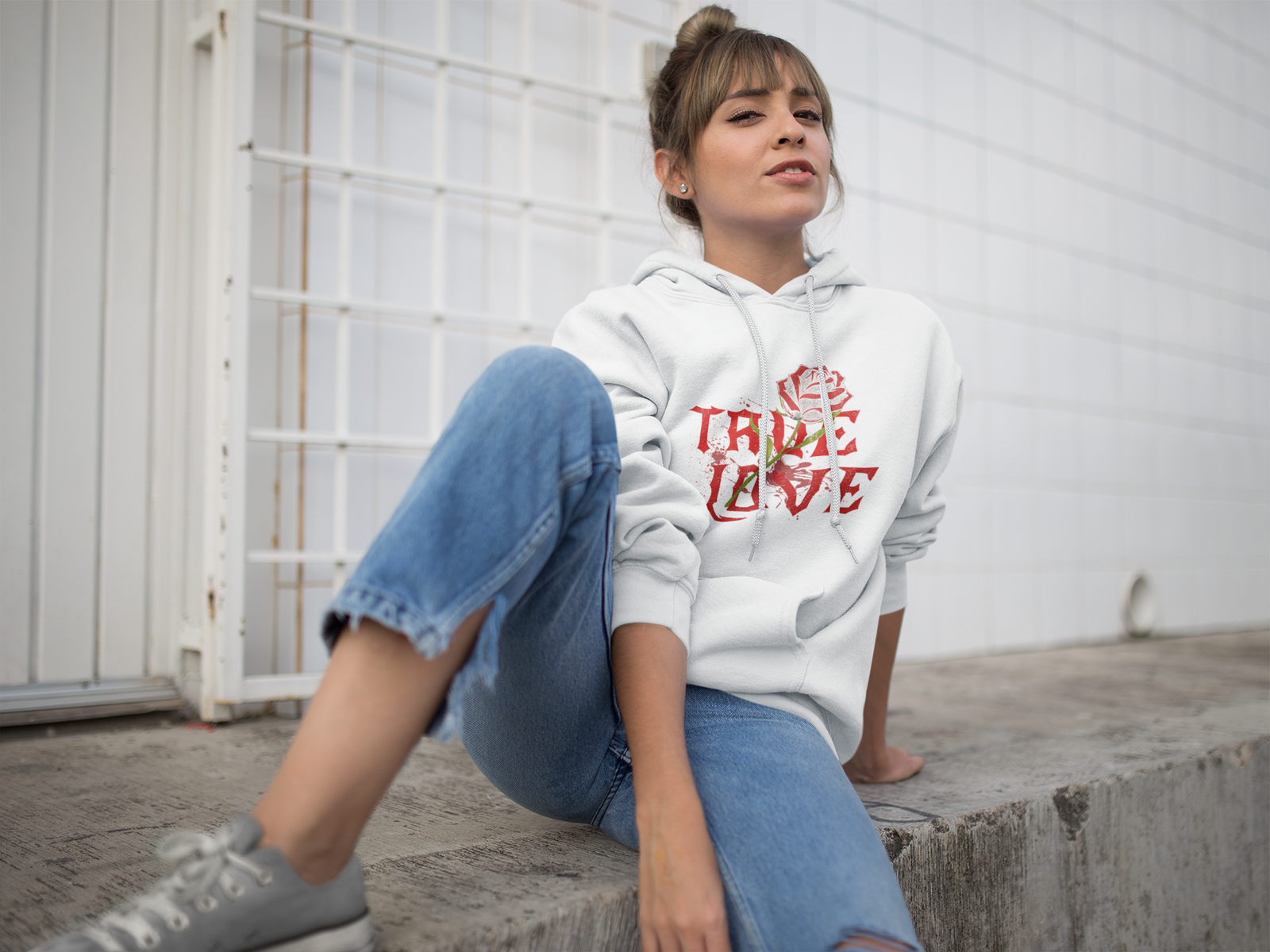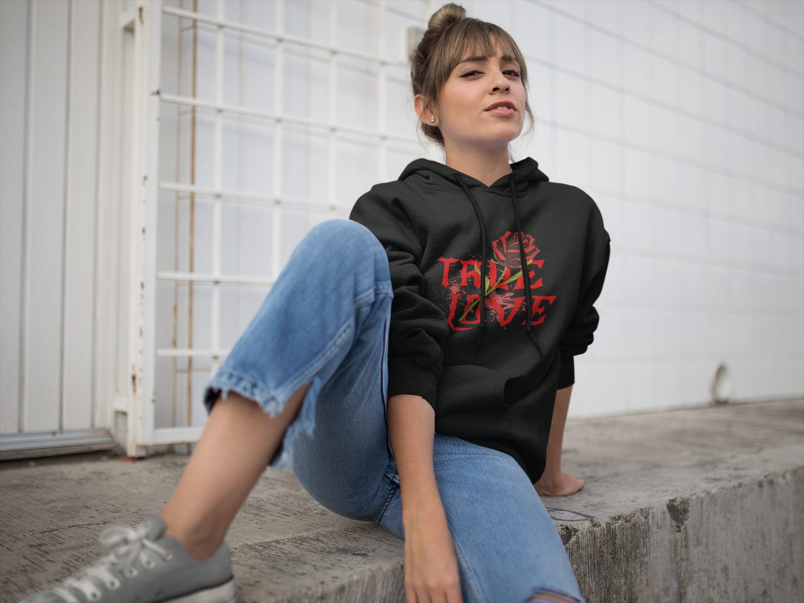 Made from a soft, durable cotton-poly blend, this pullover Womens Streetwear Hoodie keeps you warm and cozy while maintaining a sleek streetwear look. The eye-catching red “True Love” graphic adds an artistic touch that makes this hoodie stand out in any crowd. Perfect for everyday wear, hangouts, dates, or casual adventures, this hoodie is as versatile as it is meaningful.